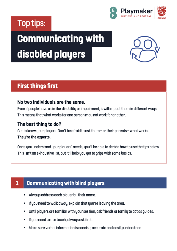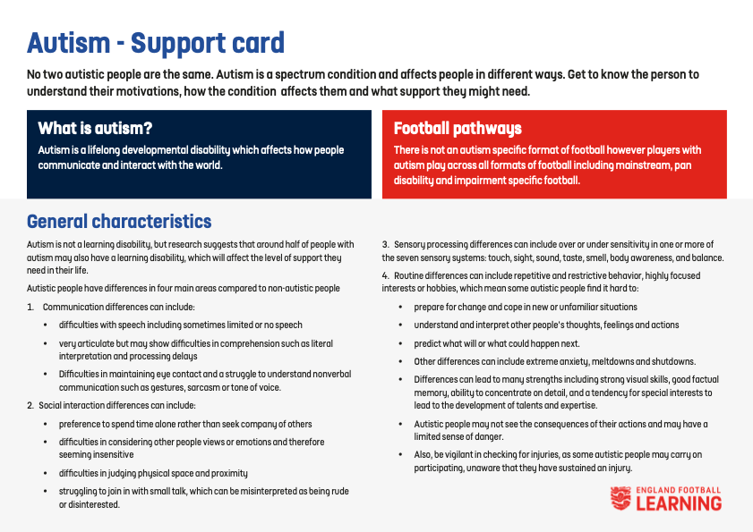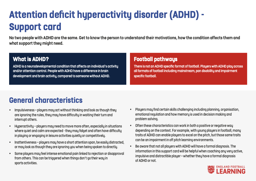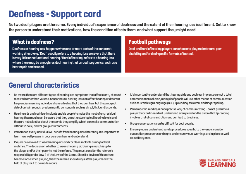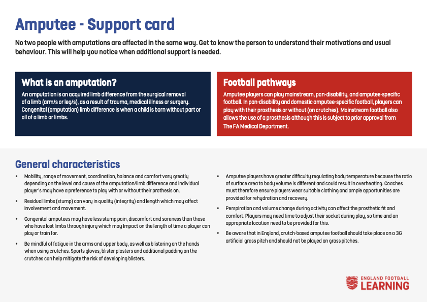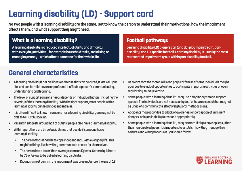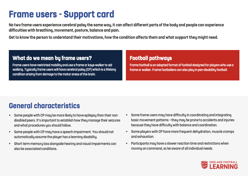 English FA Players with Disability Support Support Cards Click on the card below for full details Frame Users Learning Disability Partially Sighted Attention Deficit Hyperactivity Disorder (ADHD) Amputee Autism Cerebral Palsy Deafness Down’s Syndrome Flash Cards Emotion Cue Cards Communicating with Disabled Players Color Blindness